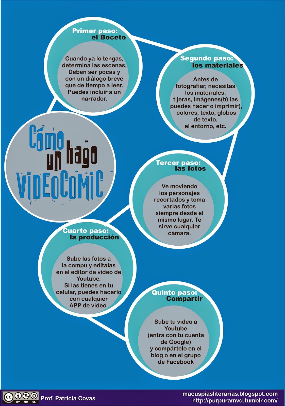 Para la realizaciónde este videocomic se utilizó: hojas de colores A4 para el fondo, un "dibujo" del personaje elegido, impresiones de Alicia de internet que se buscaron como "dibujo de línea" y se colorearon, un guion o storyboard que es el que aparece al final del video, un celular para sacar fotos y el editor de videos de Youtube de donde se colocó la música gratuita ¡es muy fácil!